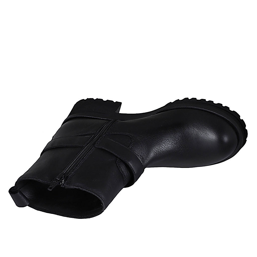 Woman's ankle boot in black leather with zipper and buckle heel 5