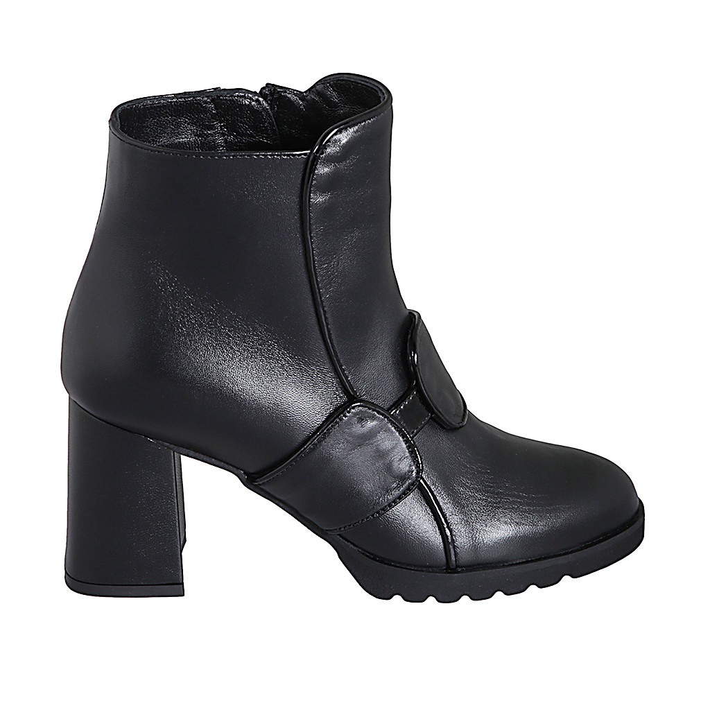 Woman's round-toe ankle boot with zipper in black leather with black patent leather accents heel 7